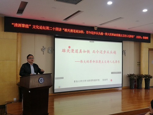 張曉明從“毛澤東詩詞研究現(xiàn)狀”“毛澤東詩詞與中國共產(chǎn)黨黨史”和“毛澤東詩詞革命浪漫主義探微”三個方面深入淺出的展開講解,表示在中國共產(chǎn)黨領(lǐng)導(dǎo)的革命斗爭和社會主義建設(shè)時期,優(yōu)秀的革命者、建設(shè)者們常以筆為犁,以夢為馬,用革命的詩詞記錄著偉大的理想信念、革命實踐與戰(zhàn)斗情懷,表現(xiàn)出昂揚的浪漫主義激情和英雄主義氣概,毛澤東詩詞就是其中的杰出代表。