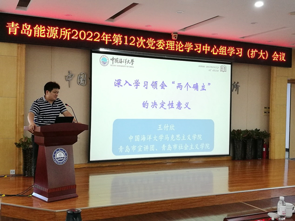 近日,青島能源所黨委召開理論學(xué)習(xí)中心組學(xué)習(xí)(擴(kuò)大)會(huì)議,邀請(qǐng)中國(guó)海洋大學(xué)馬克思主義學(xué)院黨委副書記、副院長(zhǎng)王付欣教授以《深入學(xué)習(xí)領(lǐng)會(huì)“兩個(gè)確立”的決定性意義》為題做黨史學(xué)習(xí)教育專題輔導(dǎo)報(bào)告。研究所黨委委員、黨支部書記、中層干部參加了會(huì)議,會(huì)議由黨委書記彭輝主持。