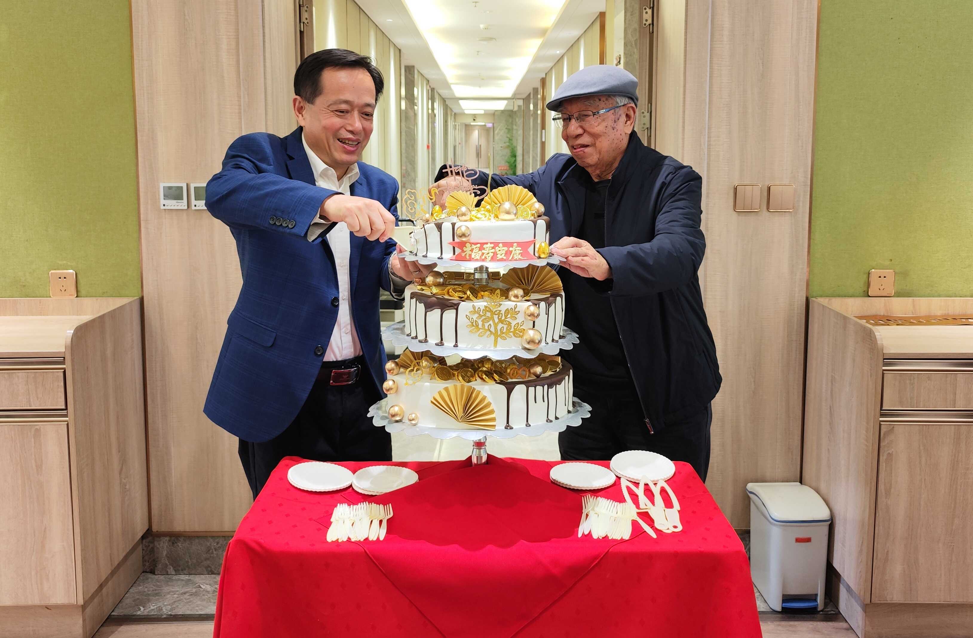 毛志遠(yuǎn)與王學(xué)良共同切開節(jié)日蛋糕
