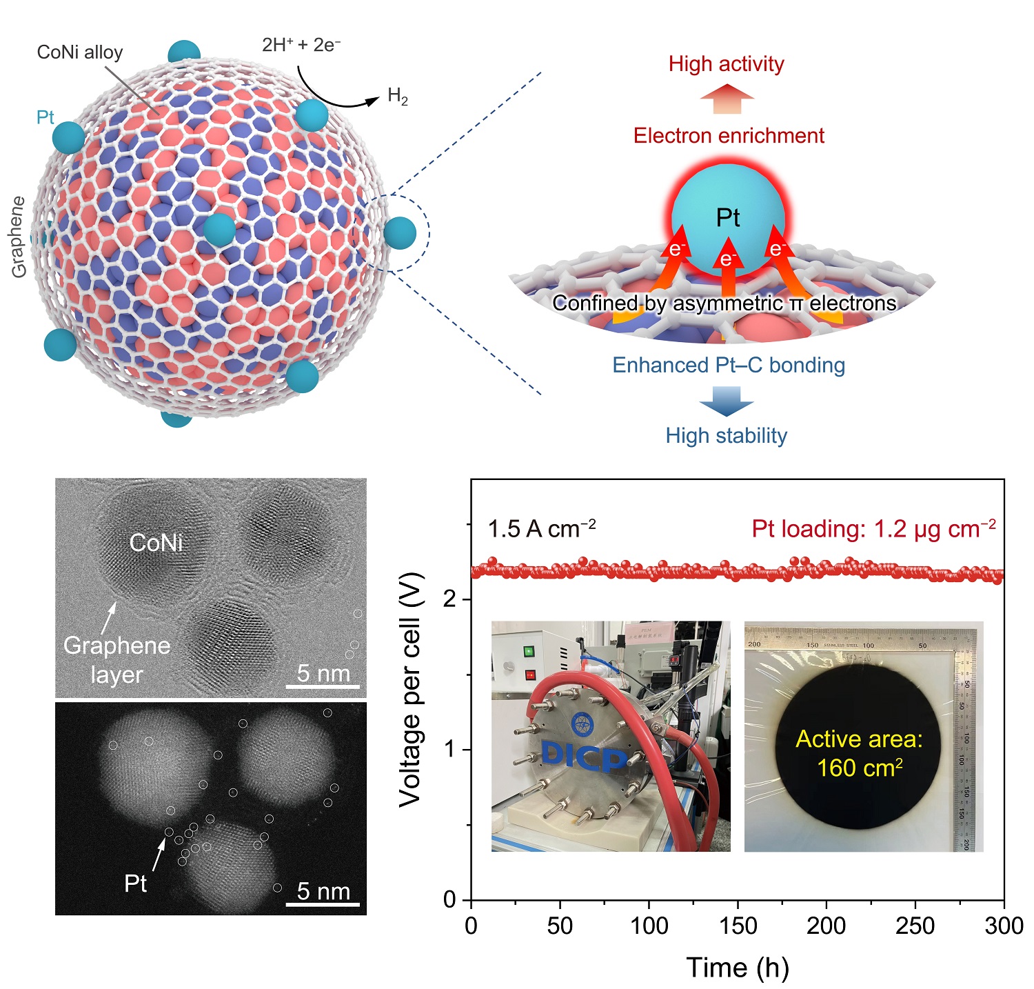 近日,大連化物所能源催化轉(zhuǎn)化全國重點(diǎn)實(shí)驗(yàn)室能源與環(huán)境小分子催化研究中心(509組群)鄧德會研究員和于良研究員團(tuán)隊(duì)與中國科學(xué)技術(shù)大學(xué)路軍嶺教授團(tuán)隊(duì)、大連化物所高效電解水制氫研究組(DNL0325組)俞紅梅研究員團(tuán)隊(duì)合作,發(fā)現(xiàn)鎧甲催化劑表面富集的不對稱π電子具有獨(dú)特的限域效應(yīng),可同時提升表面限域鉑(Pt)原子的活性和穩(wěn)定性?;诖耍献鲌F(tuán)隊(duì)設(shè)計(jì)合成了高活性、高穩(wěn)定性的電解水制氫催化劑,并組裝了千瓦級質(zhì)子交換膜電解槽,實(shí)現(xiàn)了超低Pt載量、工業(yè)大電流密度下的高效酸性電解水制氫。