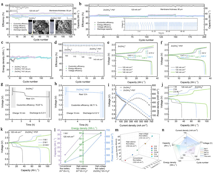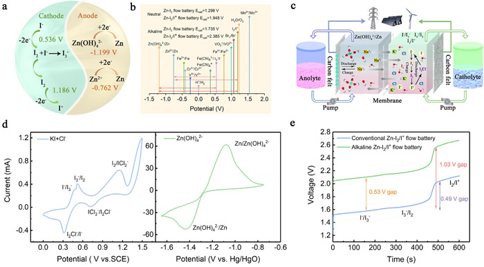 近日,中國科學(xué)院金屬研究所腐蝕基礎(chǔ)與前沿研究部腐蝕電化學(xué)課題組唐奡研究員和李瑛研究員,在高性能鋅碘液流電池研究方面取得重要進(jìn)展。研究團(tuán)隊(duì)創(chuàng)新性提出鋅負(fù)極堿性電解液環(huán)境與碘正極多電子轉(zhuǎn)移路徑協(xié)同優(yōu)化策略,通過構(gòu)建Zn(OH)42?/Zn負(fù)極與I?/I2/I+正極,成功研制出開路電壓達(dá)2.385 V的鋅碘液流電池(圖1),對(duì)發(fā)展高能量密度電池具有重要理論和實(shí)踐意義,相關(guān)成果以《A high-voltage alkaline zinc-iodine flow battery enabled by a dual-functional electrolyte additive strategy》為題,發(fā)表于《Advanced Functional Materials》,博士生楊靜為論文第一作者。