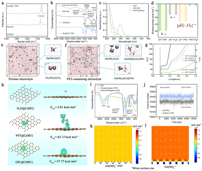 該研究在設(shè)計(jì)高電壓鋅碘液流電池基礎(chǔ)上,通過在堿性鋅負(fù)極添加同時(shí)具備含氧功能性官能團(tuán)以及電荷載體的酒石酸鉀鈉,實(shí)現(xiàn)了對(duì)電解液離子結(jié)構(gòu)-電極界面?zhèn)髻|(zhì)行為的有效調(diào)控,電池輸出功率密度達(dá)到了616 mW cm?2,有效提升了22.8%,并在140 mA cm?2電密運(yùn)行下實(shí)現(xiàn)了71.5%的能量轉(zhuǎn)換效率。更重要的是,2.5 M高濃度電解液可在120 mA cm?2下有效提升容量及能量密度至105.98 Ah L?1和185.18 Wh L?1(圖2)。材料表征結(jié)果表明,酒石酸鉀鈉顯著調(diào)控了鋅離子的原始配位平衡,加速了脫溶劑化過程。同時(shí),酒石酸鉀鈉在電極表面優(yōu)先吸附形成屏蔽層,均勻誘導(dǎo)了鋅離子遷移通量,優(yōu)化了電流密度分布,克服了枝晶生長及死鋅累積的缺陷。此外,酒石酸鉀鈉通過氫鍵相互作用破壞了水分子間的原始?xì)滏I網(wǎng)絡(luò),減少了電解液中自由水的數(shù)量,顯著抑制了析氫副反應(yīng)(圖3)。本研究通過理論計(jì)算與多尺度表征技術(shù)聯(lián)用,從分子-介觀-宏觀多維度揭示了界面?zhèn)髻|(zhì)過程與反應(yīng)動(dòng)力學(xué)的協(xié)同優(yōu)化機(jī)制,為新一代液流電池技術(shù)中高可逆金屬負(fù)極的工程化開發(fā)與應(yīng)用提供了新的技術(shù)路徑以及理論指導(dǎo)。